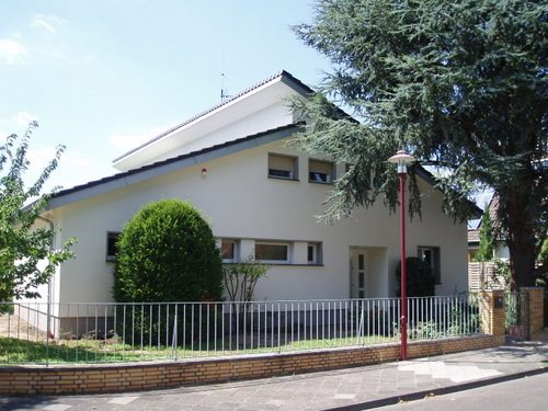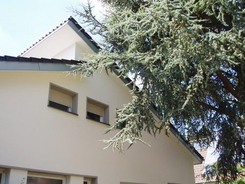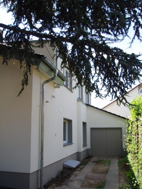 Der Bestand zeichnete sich durch eine gelungene Architektur mit verschwenderischem Energieverbrauch aus. Im Zusammenhang mit der Schaffung einer Gaube zur Wohnraumerweiterung konnte dem durch eine Aufdachdämmung und WDVS (Heizung und Fenster waren schon erneuert) Einhalt geboten werden. Die neue Fassadengestaltung rekonstruierte bis auf die gewünschten Dachüberstände das Original. Im Ergebnis ist ein neues Haus zu bewundern.