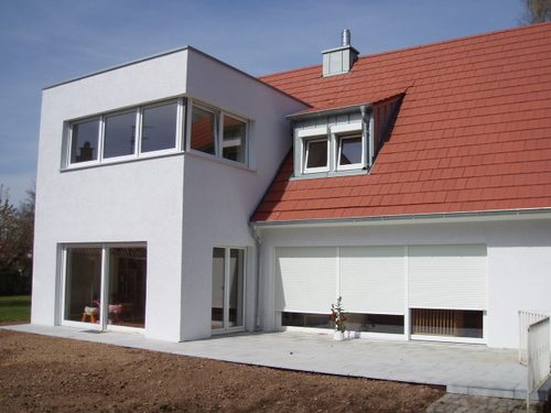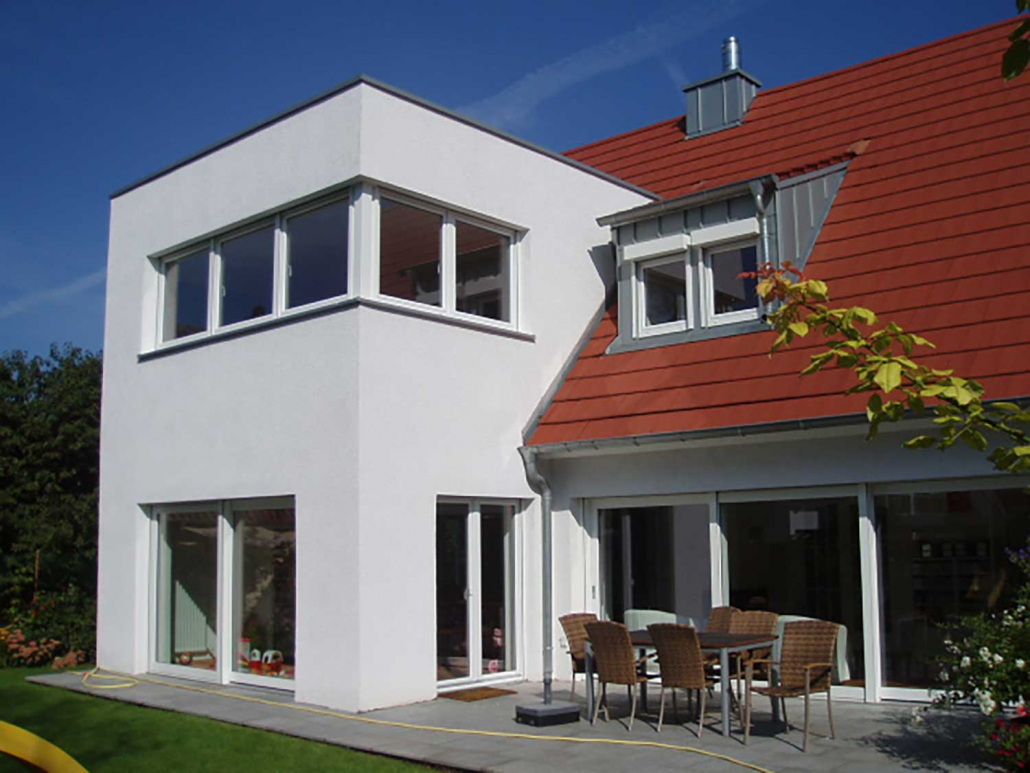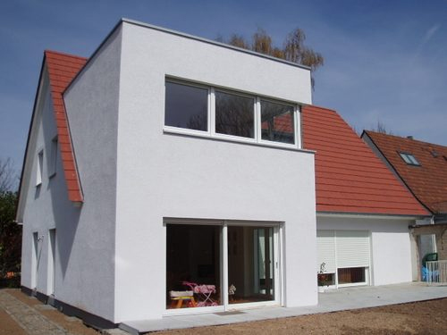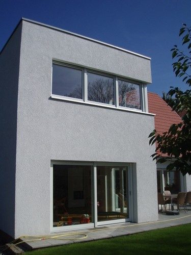 Die gefangenen Räume des Erdgeschosses wurden durch die Entfernung der Trennwände zu einem modernen offenen Koch-,Ess- und Wohnbereich zusammengelegt. Im Obergeschoss wurde der vorhandene Grundriss den neuen Bedürfnissen angepasst und der eingeschossige Anbau aufgestockt, um ein zusätzliches Schlafzimmer zu schaffen. Die Gartenfassade hat durch die Aufstockung und die erweiterten, großen Fensteröffnungen eine neue Ausrichtung erfahren, die dem modernen Wohngefühl der nächsten Generation gerecht wird.