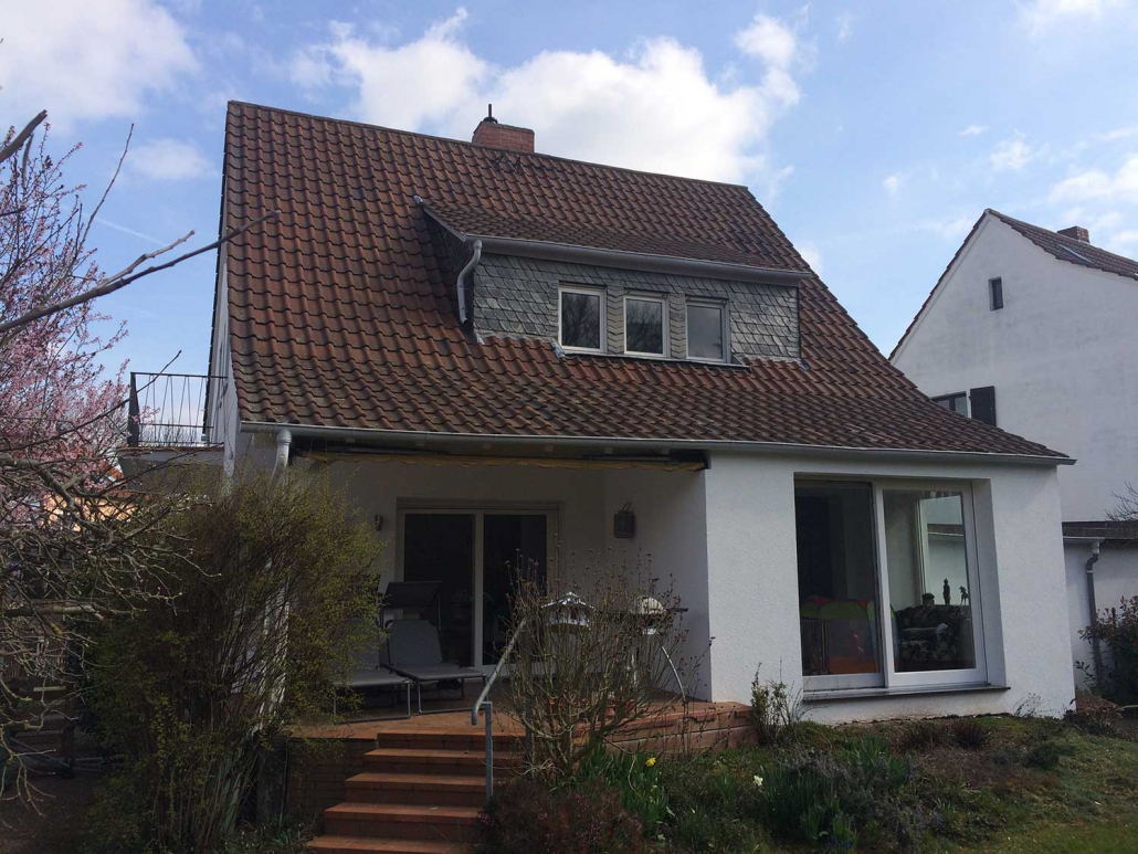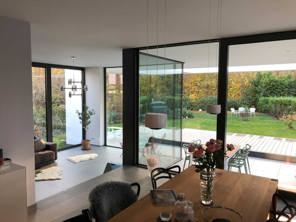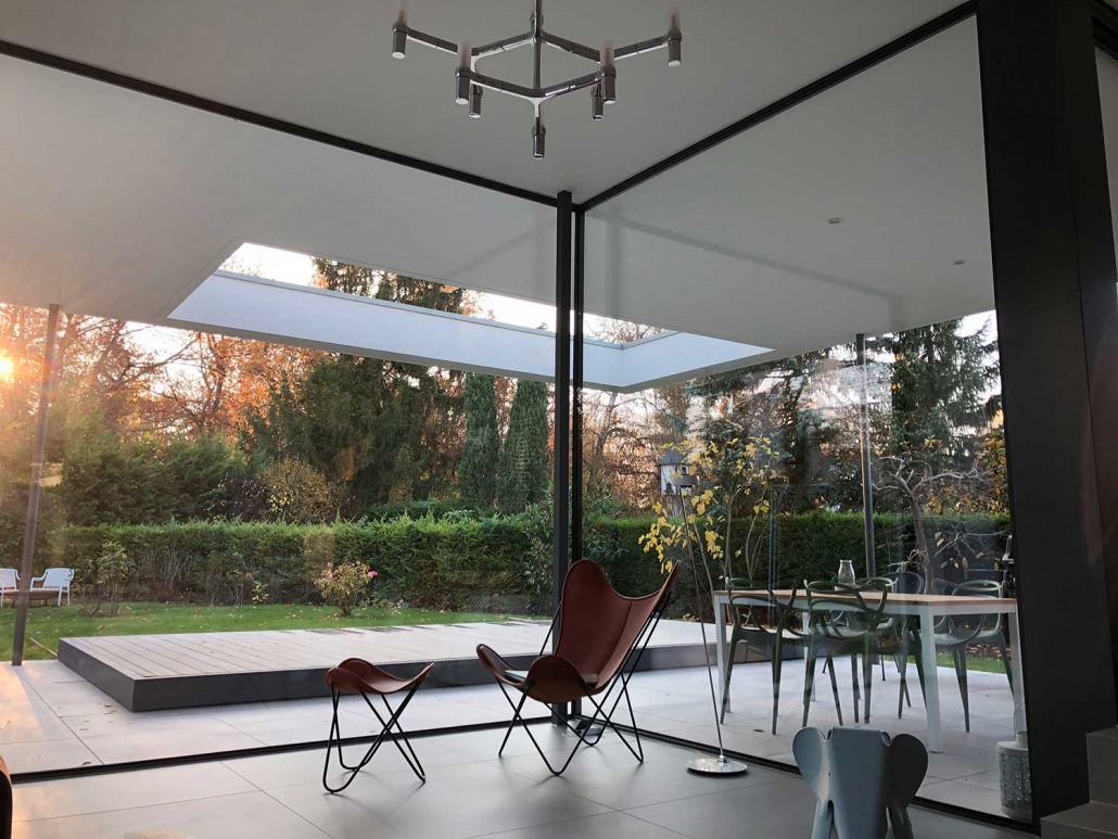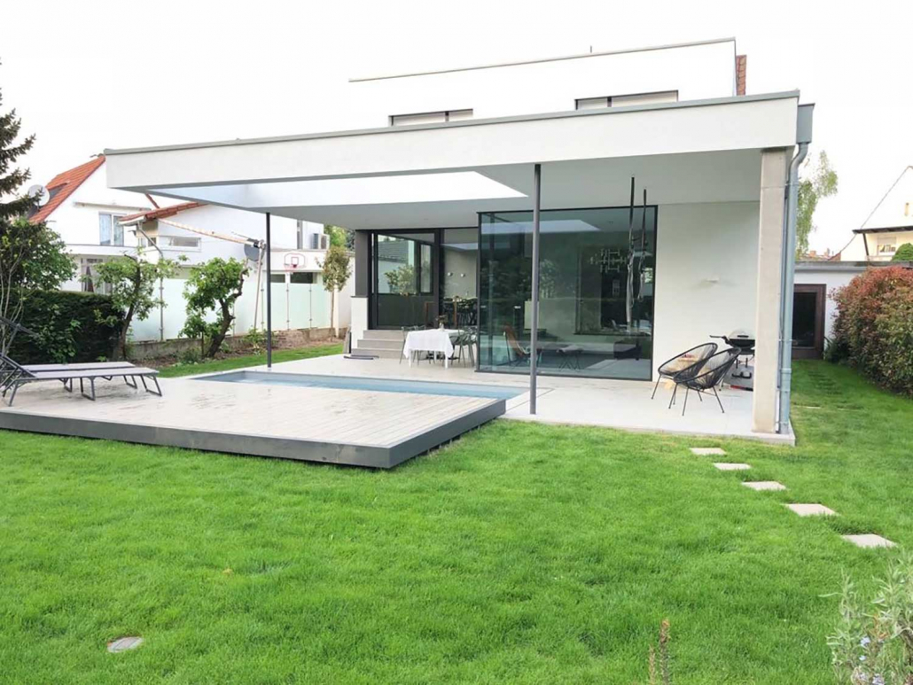 Statt einer kleinen Terrasse öffnet sich das Haus nun mit großzügiger Verglasung und weit auskragender Überdachung zum Garten. Der abdeckbare Swimmingpool ergänzt das neue Wohnkonzept um eine private Rückzugs- und Erholungszone – modernisiert mit Blick auf Licht, Raum und Lebensqualität.