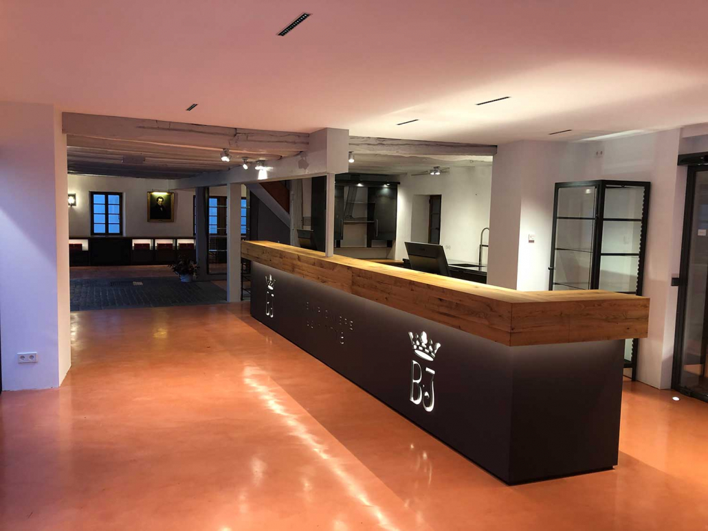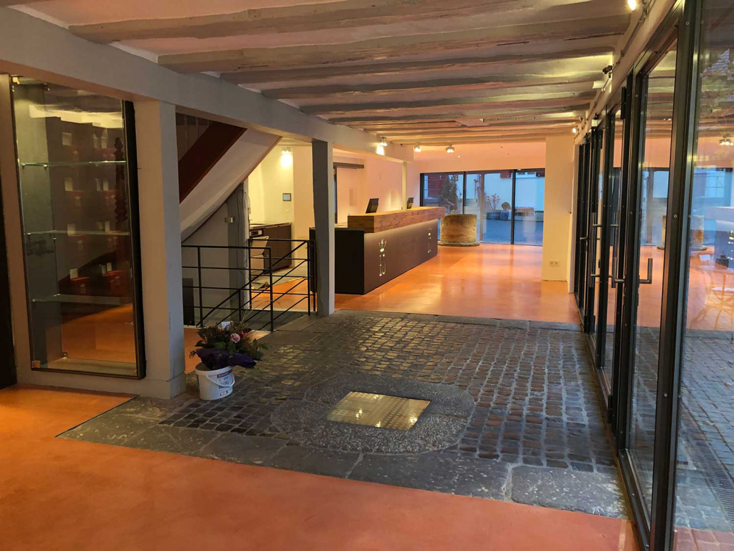 Die neue Vinothek öffnet sich großzügig zum Hof und schafft einen einladenden Übergang zwischen Alt und Neu. Im Innenraum verbindet sich ein erhaltenes Stück Kopfsteinpflaster im Eingangsbereich mit klaren, modernen Elementen wie einem kubistischen Holztresen und präzise gesetztem Lichtdesign – ein Ort der Begegnung, der Geschichte spürbar macht und gleichzeitig zeitgemäßen Anspruch vermittelt.