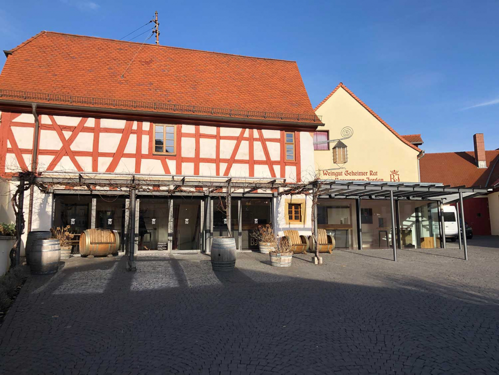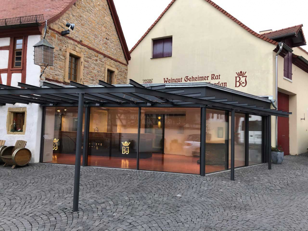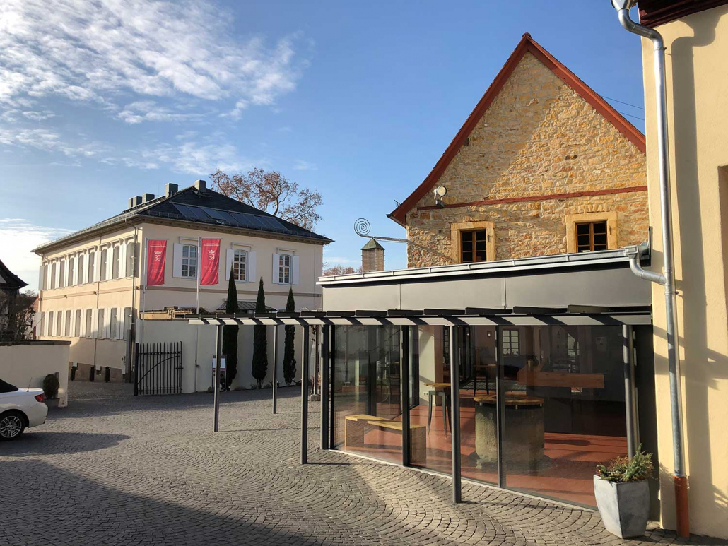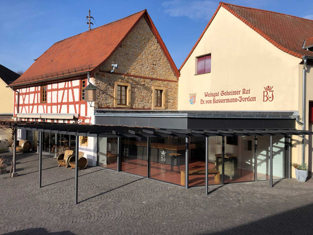 Der historische Hof des Weinguts Bassermann-Jordan mit seinem charakteristischen Fachwerk wurde um eine moderne, voll verglaste Vinothek erweitert: zeitgemäße Architektur mit Respekt vor Ort, Material und Nutzung.